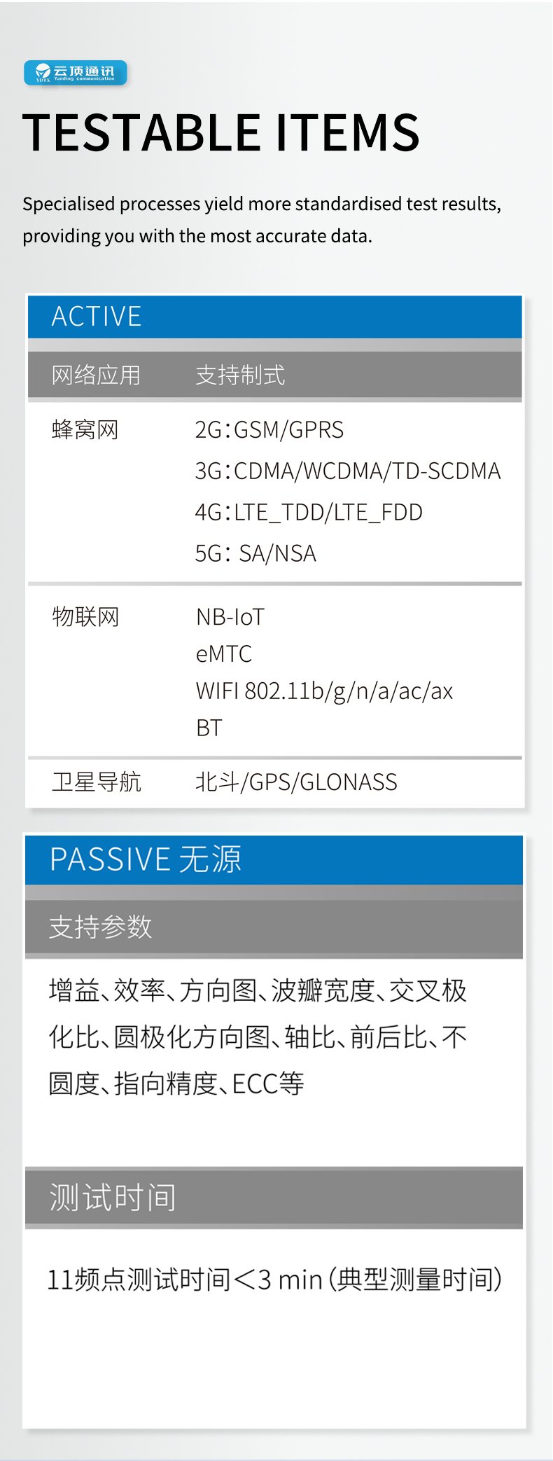 The test time at 11 frequency points is less than 3 minutes (typical measurement time)